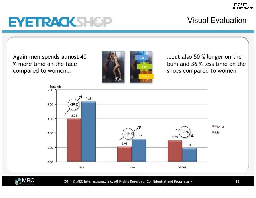 - 结果男人看脸的时间再次比女人长了40%,看臀部的时间更是多了50%,但就是不怎么看鞋子(时间短36% )