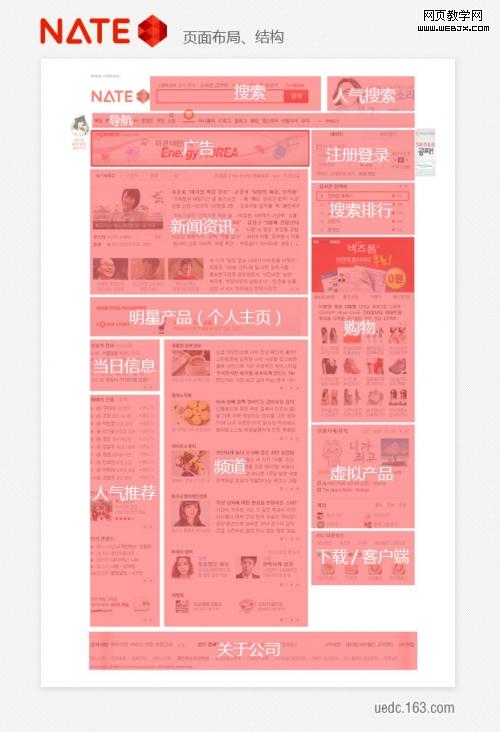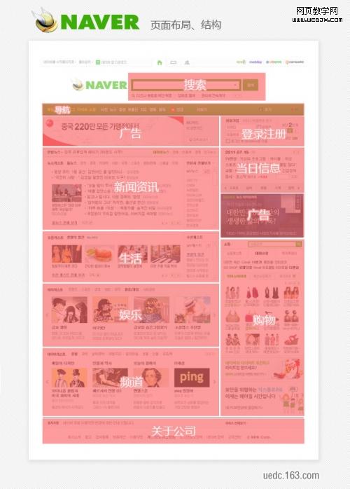 以上三个门户的首页页面布局和结构中可以看到比国内的几个门户网的布局大不一样。韩国的首页布局通常都是以简洁清晰、区块明显的的特点吸引用户。但这并不意味着内容上单一、乏味。韩国的门户更多的是利用清晰的导航来引导用户更快、更直接的到达用户所需要的页面中,而不是把全部的频道、分类罗列在首页。记得曾经在一位韩国设计的博客上看到过他写的一段话,讲到:用户预览网站就像逛商场一样,商场不一定为了大卖把所有商品堆积在顾客进门的大门口处,而更重要的是怎样让用户少走一些弯路,买到更多自己满意的商品,这就需要一个清晰明了的导航和合理科学的布局。