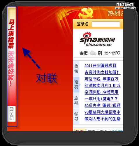 1. 19楼很少出现对联广告,建议对联广告,如果出现,3秒钟后,自动缩小成竖条放置在屏幕左右两侧,同时可关闭,类似sina。