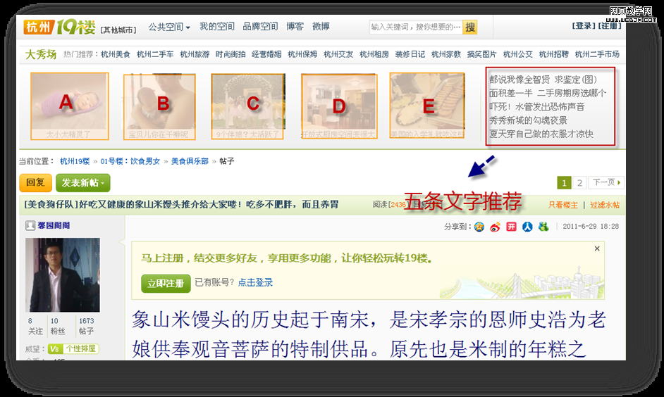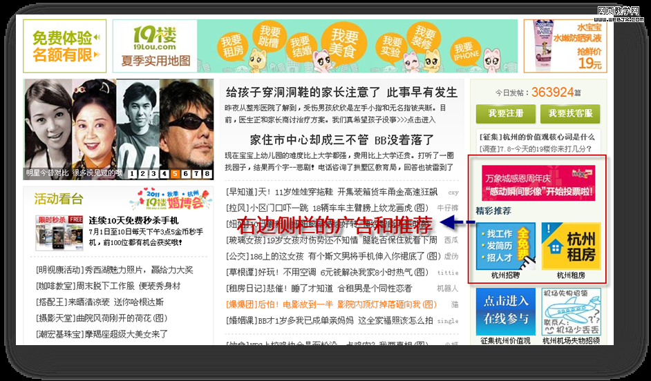 对于一些房产网站和地方社区网站来说,商家在网页上的硬广是其主要盈利收入,不断增加的广告收入,同时带来不断增加的banner广告,有的甚至在首页达到三屏至多,贴内五条硬广,另外还有无处不在的悬浮广告,关不掉的对联广告等等,用户苦不堪言,但为了盈利,能有什么办法呢,19楼,作为运营最好的地方社区网站,在广告位的设置方面,我觉得为我们提供了很好的参考。在不影响用户体验的前提下,banner广告怎么放呢。