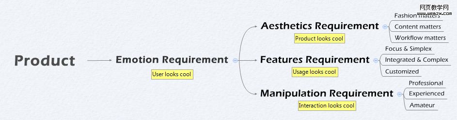 - 最后是情感需求(Emotion), 产品帮助用户建立自我愉悦,所谓满足。这种满足涵盖了外观和行为的需求。