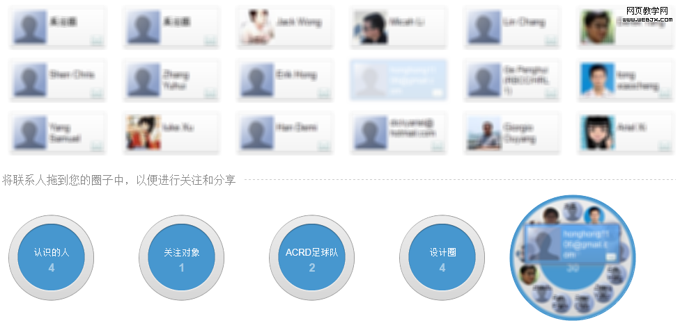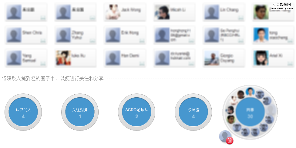 Circle(圈子)是Google+社交服务里的一大亮点,在将联系人添加或移除出某个circle的时候,两者的交互方式是对称的。