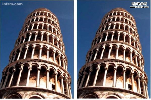 《比萨斜塔》。将两张完全相同的比萨斜塔图片并列,看到的却似乎是倾斜程度不同的两个塔。这个效果来自人对深度的错觉。 (南方周末资料图片)