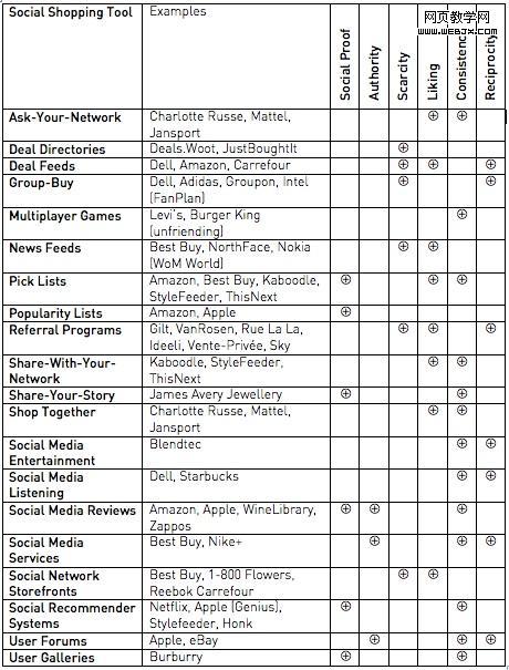 - 社会化媒体评论 通过具有权威性质的专业评论者(博客评论、网络杂志评论、YouTube评论)和真实的消费者,赋予人民的声音以权威——Amazon Affiliates, Gilt, VanRosen, Rue La La, Ideeli, Vente-Privée, Sky invite-a-friend