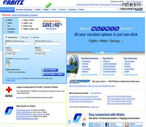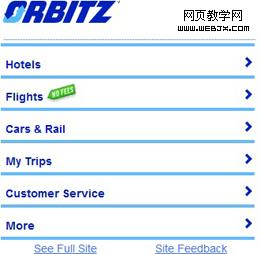 桌面站点可以有1024*768的分辨率,而智能机仅有320*480分辨率,如何在如此小的分辨率中,在不降低用户体验效果前提下进行设计是很有挑战性的。桌面站点常常包涵更广的内容,而移动站点仅包涵一些符合使用情境的主要功能和特征,如图1、图2所示Orbitz的桌面站点和移动站点。移动站点应该通过移动设备将用户最需要的内容和特征展现给用户。一些站点内容,信息架构和屏幕布局都是在深度理解客户需求的前提下设计的。