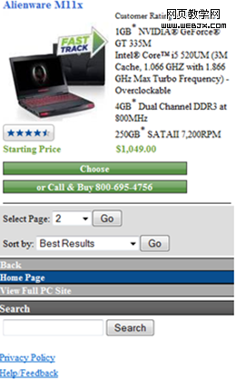在网页中,我们经常会看到一些促销,营销或者导航的图形信息。如图7所示的dell站点,设计者经常需要设计一些促销或营销的图形,如图8所示、公司LOGO始终保持着导航的目标,通过它,用户可以进入主页。而在移动站点设计中,应该减少这些图形,原因有二:其一,一些移动设备并不支持和传统网页站点一样显示方式;其二,移动屏幕较小,显示内容有限,除此之外,过多的显示内容会降低移动设计的运行速度。