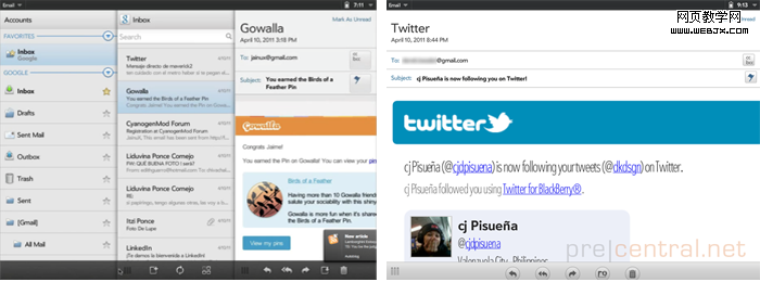 webOS中,邮件默认为三栏显示,通过点击或滑动,可以调整栏目显示比例。当将邮件内容拉至最大时,则可以全屏显示邮件内容。另外当你新建一封邮件时,会弹出全屏页面,方便预览撰写邮件。