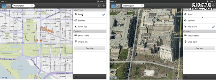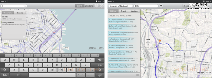 地图是需要特别说明的一个地方,webOS 3.0中微软的Bing替代了之前的Google地图,相比较最出色的一个新功能应该是鹰眼了,支持实景45度视图。其他的诸如线路、搜索等方式从功能到界面与iOS的google地图基本相似。要说有不同也是控件布局的微调。