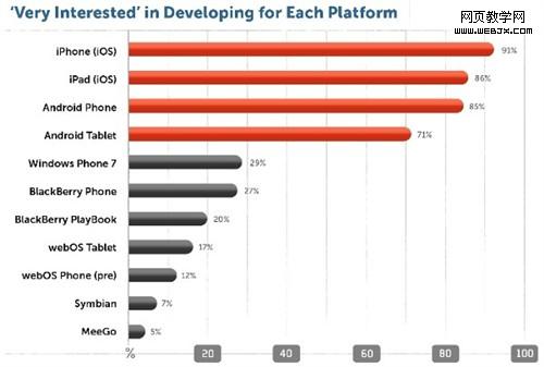 据IDC最新调查数据显示,iOS和Android仍是开发者最感兴趣的平台。从图中可以看出iOS和Android牢牢占据了前四位,webOS的份额还是很少的,所以要做的确实还有很多。