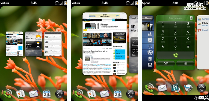 多任务:webOS中,传统意义上的程序概念被弱化,取而代之的是卡片系统。所有的任务均以卡片的形式出现。任何时候点击手势区,都会进入卡片视图。卡片视图中展现出正在运行的任务,这些任务以多窗口的形式呈现。你可以看到正在运行的全部任务,可以通过滑动进行切换,点击后进入任务,这样一种操作方式,是极其美妙的。更为重要的是webOS 中的多任务的流畅度可以得到很好的保证,可以说webOS的多任务是世界上最好的移动系统多任务平台。