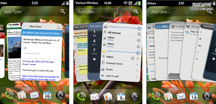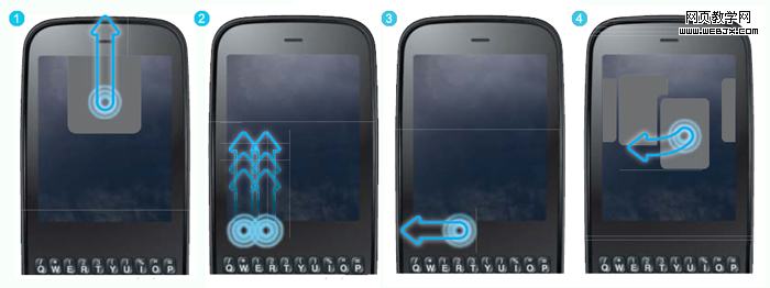 手势操作:手势区域是Palm一个了不起的创意,用户可以通过各种手势与系统进行交互。尤其是在webOS平台上,配合手势完成卡片的关闭、切换和其他命令,十分的方便。