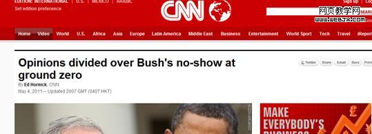 CNN资讯标题上面并没有面包屑,而是将twitter和share等分享占据“有利位置”(2011年5月5日抓图)
