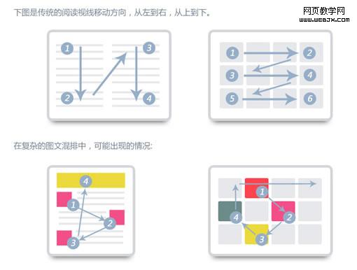 在阅读信息的时候,常常受到周围文字和图像的干扰,并不是那么顺畅,根据人眼视觉心理,会有几种容易引导或者说干扰到视觉移动方向的特点。