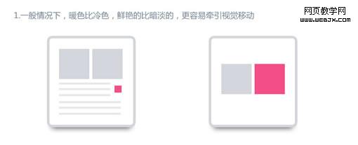 在上左图中,第一眼看到的是不是红色的色块?右图中,是不是感觉红色的色块向前突出,而灰色的色块向后退?这就是视觉心理造成的,波长长的色彩比波长短的色彩更容易被人眼识别,也就是暖色的、鲜艳的比冷色、暗淡的颜色更“跳”一些,当一个页面中,“更跳一些”的元素无章的排列的话,人眼的视线就会跟这这些吸引人的小元素也跳来跳去了,感觉“页面花”就有这个原因,合理的运用这个规则,就可以达到增强信息顺畅的传达的目的。