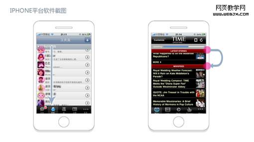 左图为IPHONE平台QQ2010界面,视觉通过鲜明彩色的头像图片牵引视线顺势向下。