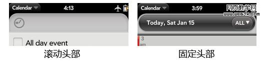 在设计一个应用程序的时候,我们常常会为头部在浏览的时候应不应该滚走而徘徊,webOS系统默认提供了两种头部供我们选择:滚动头部和固定头部。