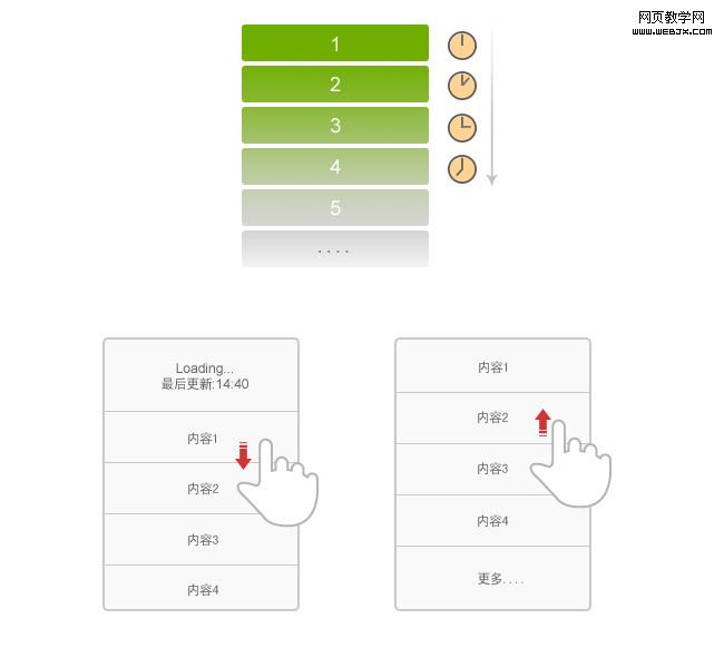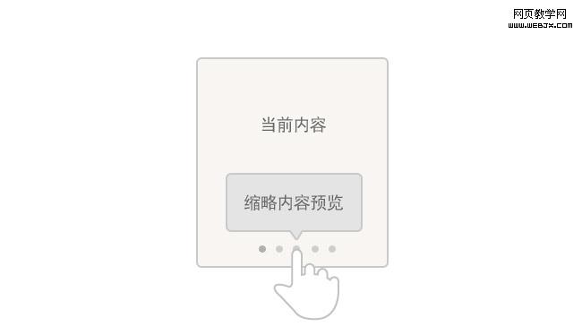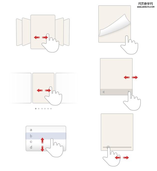 以上就是对手机端产品翻页控件做的一些粗浅整理归纳。具体到设计应用中,我们需要根据产品性质、用户操作使用情景、手机和操作平台本身的特性等具体情况来考虑设计使用翻页控件。