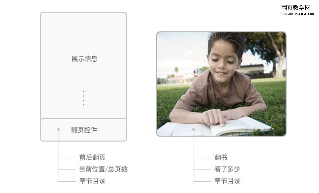 所展示的信息具有很强“连续性”“流”等属性,典型的例子是网络小说、电子书等长篇幅的阅读类信息。对比传统的阅读行为,这类产品的翻页操作要尽可能的符合用户的心理模型:一本书拿在手里,书有多厚,看了多少,书的章节目录,上一次读到哪里(通过书签或折页等记号)……都是一目了然的;此时的翻页控件,也不仅仅要提供简单的前后翻页功能,同时也告诉用户当前的阅读位置(如“23/344页”等),提供快速翻页和定位的功能(如页面跳转功能和缩略浏览等),同时能够标记最后一次阅读的位置。