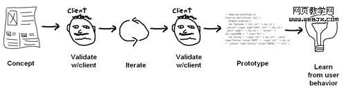看上去很熟悉?是的,如果你熟悉敏捷的或是其衍生产品。整个过程从轻量级的概念开始。它可以在一块白板上、一张纸巾或者是快速线框图上生成。它的目的是将创意或者流程的核心概念快速展现在你的团队面前。