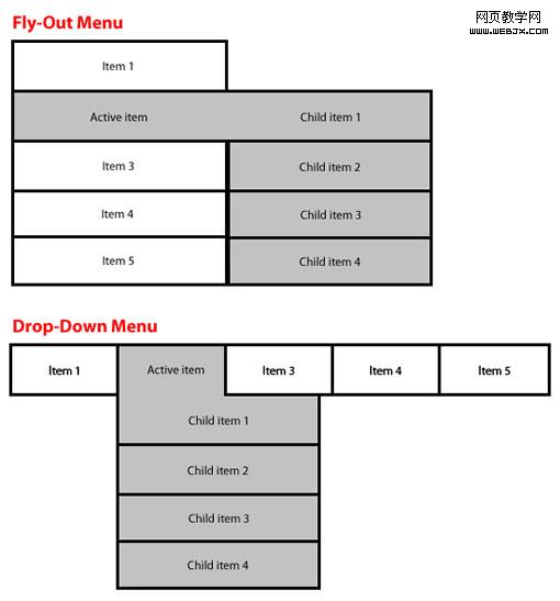 除非你在主导航链接边上放置一些标识(通常是箭头图标),不然访客可能不知道那有包含子导航项的下拉或出式菜单,因此使这些标识很明显是非常重要的。同时出式菜单和下拉可能使得导航在移动设备上非常难用,所以要确保你的移动样式表处理了这种情况。