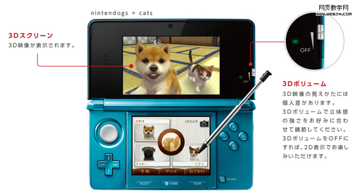 “Nintendo3DS 影像是用左右目视差的原理来生成立体感的。但是观看3D 影像是存在个人差异的。比如左右眼视力差大的人 ( * 1) ,因人而异看到立体影像可能会有一些难度,也有可能存在完全看不到立体影像的情况。Nintendo 3DS 为了能让更顾客享受 3D 影像带来的乐趣,引入了3D Volume 控件。3D Volume 向下滑动,影像的立体感会渐渐削弱 ( * 2) 。滑到最下方,看到的将是完全的2D 影像,这使喜欢用2D 影像来玩游戏的人也可以享受这个过程。