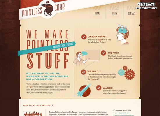 Pointless Corp has a very asymmetrical design, which makes it creative, whimsical, and visually appealing (although there is also symmetry involved to help keep the design cohesive). Note how some shapes and directional flow are repeated (a manifestation of translational symmetry).