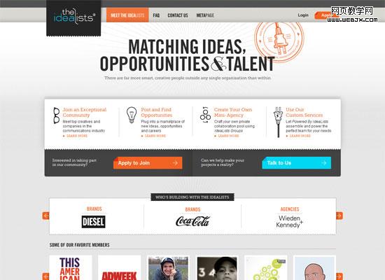 这是一个使用旋转对称的案例。在页面上部特性的描述上采用了一般性的旋转对称,下面“我们的团队”一栏中,实实在在的采用旋转对称。除此之外,虽然页面背景采用不对称设计,主要栏目设置却保持平衡。这个页面是不对称和对称的完美融合,是视觉趣味与平衡、比例与整体性的完美搭配。