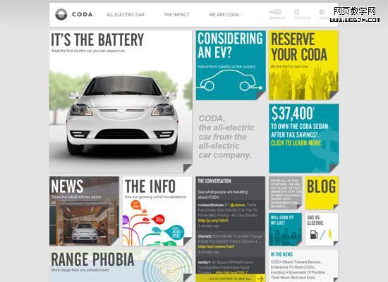 Coda Automotive is a content-heavy site, which means balance and organization is essential to site usability. We can witness a lot of translation symmetry in this design, where the same-sized block shape is repeated in various locations. For interest — and likely due to practical content-related layout purposes as well — the shapes of the squares also vary in size, yet still maintain visual balance on either side by mixing up size versus complexity, color, and density.