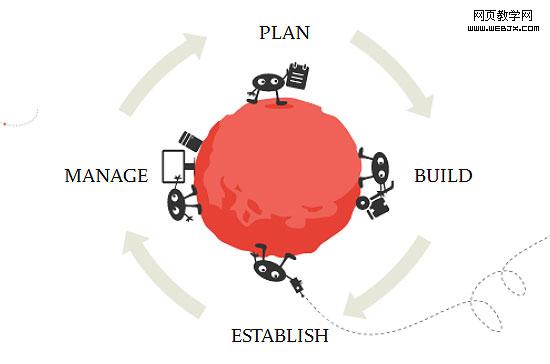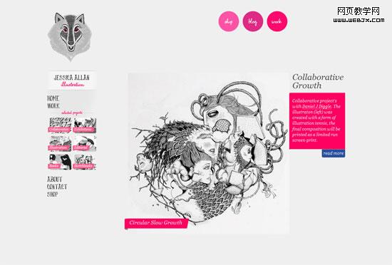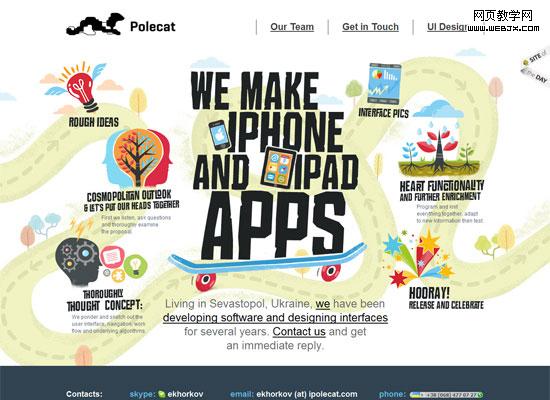 这个页面使用不对称的设计手法。此种风格使页面看起来富有创意、天马行空、视觉上有很大的冲击力(同时也使用对称手法以保持设计的一致性)。要学习各种形状和流程的重复使用(这是平移对称的展现)。