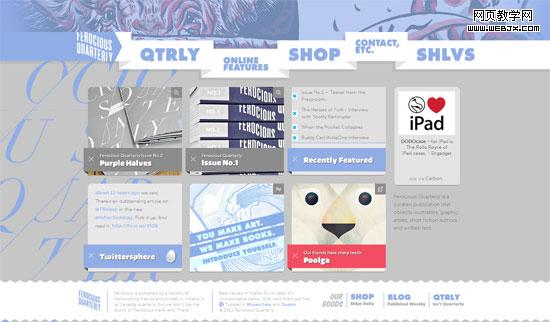 The background and main navigation menu of QTRLY are abstract. However, the main featured pieces of content are repetitive blocks, translated horizontally and vertically for balance and structural integrity.