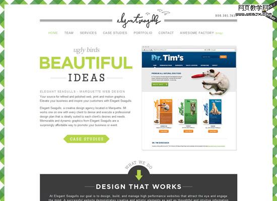 The Elegant Seagulls website is a symmetrical design. The logo, tagline, and navigation are all centered, as are many other header elements. The listed section of services towards the bottom of the layout also displays translational symmetry.