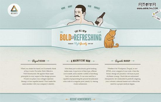 这又是一个以居中为主的设计,页面元素居中并水平反射。我们要学习的是,如何使用不对称的元素让整体性对称布局更出彩。