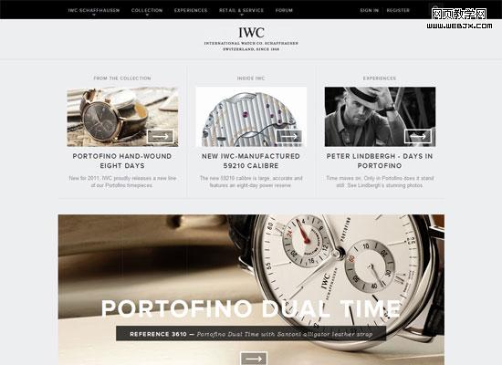 在IWC的网站中,使用了平移对称和反射对称。许多内容元素和内容块居中,并且均匀地成比例的分布在两边形成反射对称。每一块区域保持相同的尺寸扩展至整个页面。整个设计中两种对称方法的运用,使网站看起来即沉稳又专业。