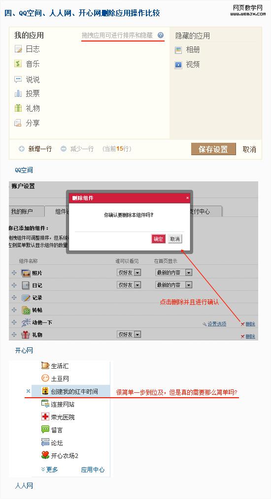 说到确认操作,继续趁热打铁,人人似乎都不喜欢对其用户进行确认提示,上面是QQ空间开心 人人的应用删除操作