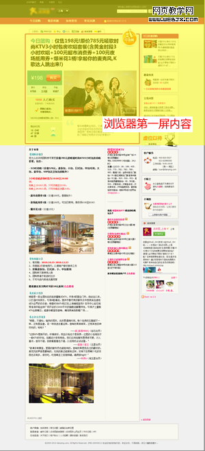 观察8:在团购网上,Wong从始至终,都没注意到团购网页的第二屏内容,实际上第二屏以下的内容Wong完全就忽视了,他需要的主要团购的内容都在第一屏内获得了。第一屏在网页的设计中至关重要,如果你希望用户浏览到更多的第一屏以下的内容,你应该从视觉上让用户发觉第一屏并不是全部的内容;可以利用“锚”,“分页导航”等跳转让用户从第一屏跳到下面内容上。