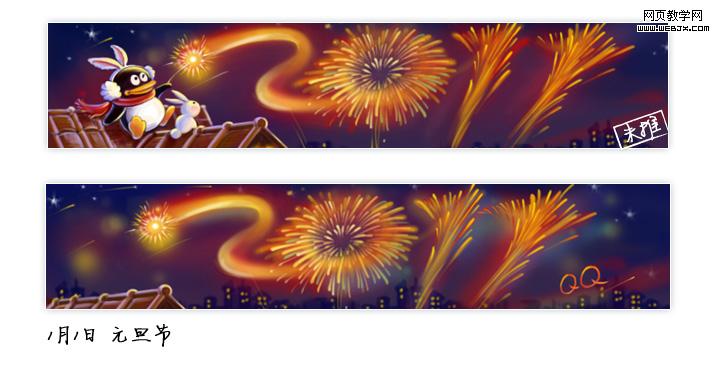 元旦节过程稿是这样构思的:QQ手拿“仙女棒”在夜空中划过,随即燃起2011字样的节日礼花。小兔目不转睛地端坐在屋顶上,被空中绚烂的烟花吸引,寓意2011新年的到来。画面的主要人物角色遭到产品的挑战,几经讨论,思考归纳人物被砍的纠结点有三:一,在屋顶上燃放烟花爆竹,场景有待商确;二,画面元素过于复杂;三,兔子生肖用于元旦还是新年。