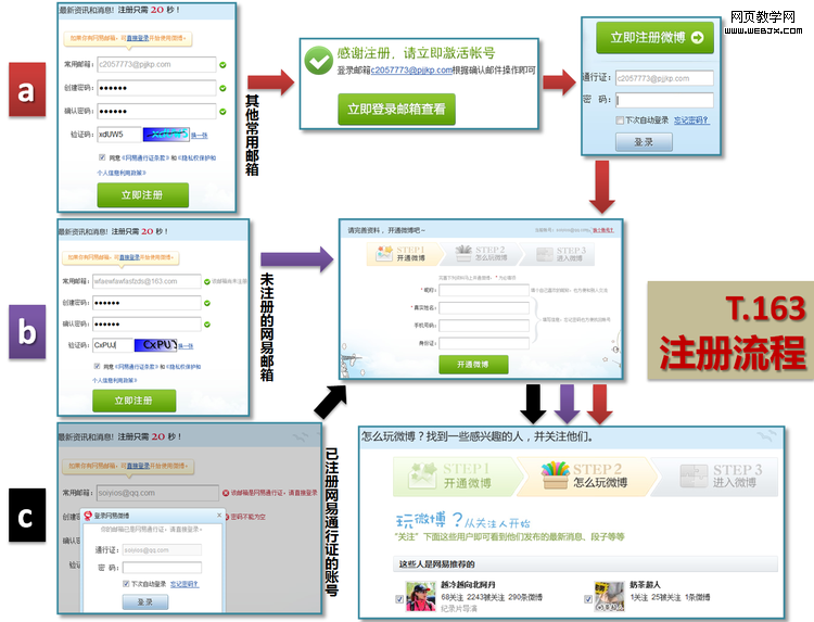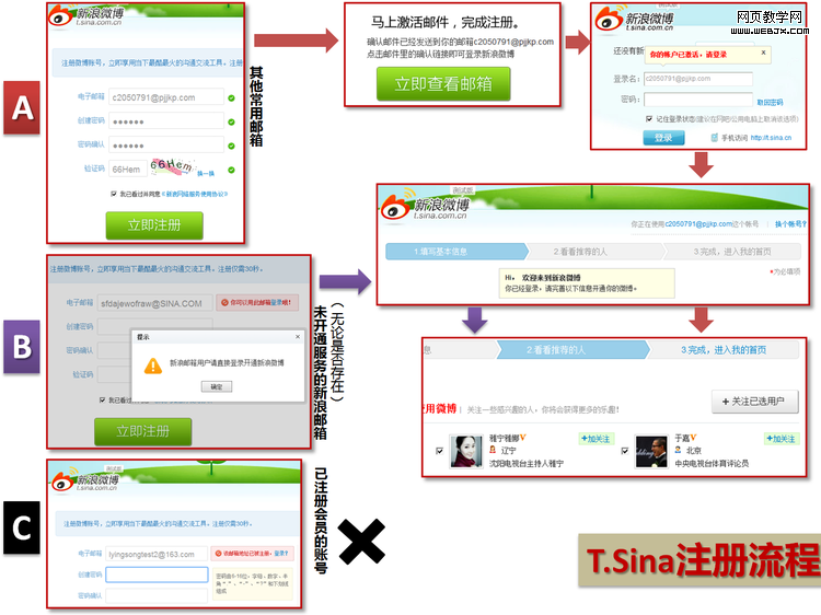 情况C:用户输入已注册新浪会员的其他邮箱,提示“该邮箱地址已被注册,登录?”,然后就结束了。用户想登录?自己点鼠标。