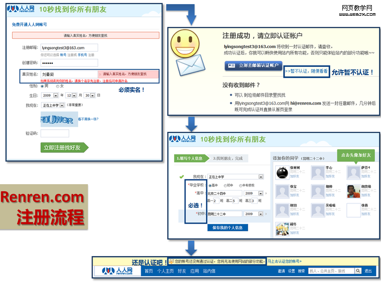 作为一个目标群体集中、核心价值明确的社交网站,人人网的注册流程非常强势的引导着用户向其“价值观”靠拢: