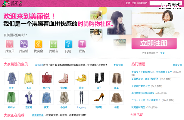 最先是从女朋友那里知道美丽说这个网站的,美丽说是一个时尚购物社区,是专为女生设计的一个分享网购链接、交流打扮和网购心得的一个时尚社区,网站界面简洁,首页上有用户即时推荐商品,可以说是一个分享时尚链接的微博站点。
