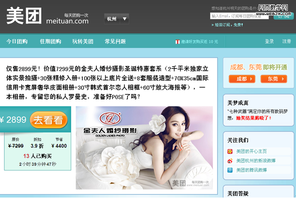 以美团网为代表的团购网站,是最近社会化购物网站中一个很热门的类型,这类网站应该是社会化购物网站的集大成者,每天团购一次,为消费者发现最值得信赖的商家,让消费者享受超低折扣的优质服务。