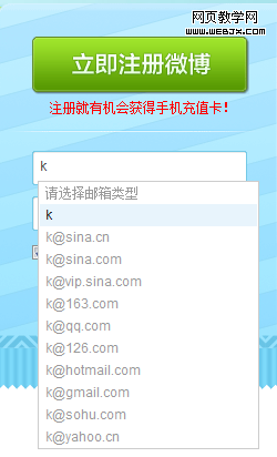 让我们对比下一个比较给力的正面案例——新浪微博。当用户输入第一个字母的时候,系统已经将可能的邮箱直接推荐过来,非常方便。即能减少用户的操作成本,又可以大大降低因错误输入导致的无效反馈,对系统的底层后台无疑也是件幸事。