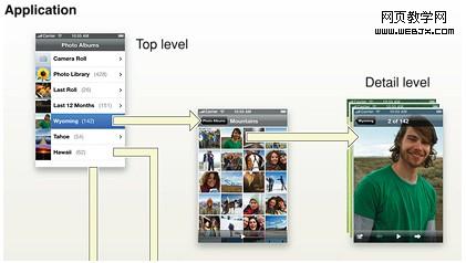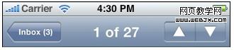 在iPhone平台上,如果应用程序有信息层级关系(比如邮箱>收件箱>邮件),利用title进行导航,导航栏左侧始终是返回按钮,右侧如果有必要,可以放针对内容的操作控件,中间有标题。