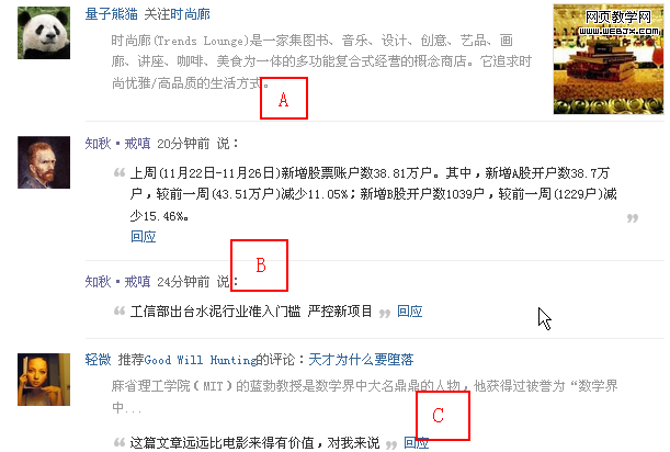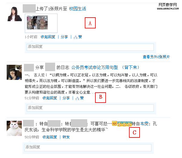 第二,对于好友的关注、分享内容等,只能进入新窗口中查看并且推荐,诸如A、C;这就等于多出了一个层级(下面与sina微博相比较,sina微博没有任何层级)。