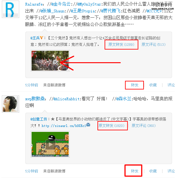 第二,转发按钮是如此的重要,如此诱人去单击。大家看图,新浪微博中的交互,第一个是转发,第二个才是评论。而人人,第一是评论,第二是分享(即“转发”),而且评论的UI更显眼。
