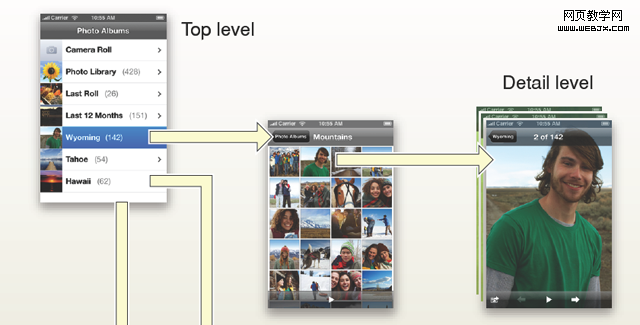 在iPhone User Interface Guideline中,提出了三种不同形式的Application Style,其中一种为Productivity Application,对层级信息的处理方式如下图。