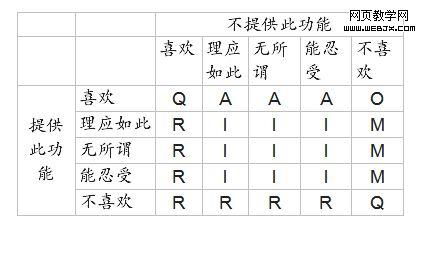 其中A = Attractive = 魅力属性,M = Must-be = 必备属性,O = One-dimensional = 一维属性,I = Indifferent = 次要属性,R = Reflected = 与假设相反的属性,Q = Question = 有问题的回答。