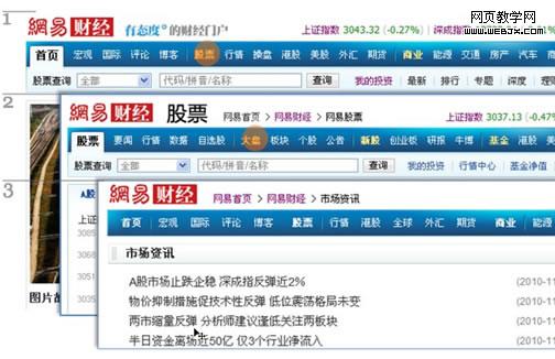 第一幅图是财经频道的首页、第二幅为二级频道股票的首页,第三幅图是大盘的首页。