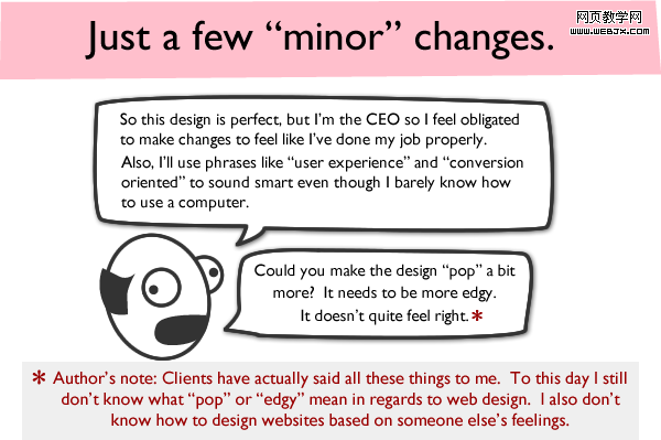 作者: 客户确实跟我说过这些的话。但至今我都还无法理解他所谓的网页设计上的“Pop”和“Edgy”是什么意思,我也不知道如何用他人的感觉来设计(以用户为中心?站在用户的角度?以用户为本?)