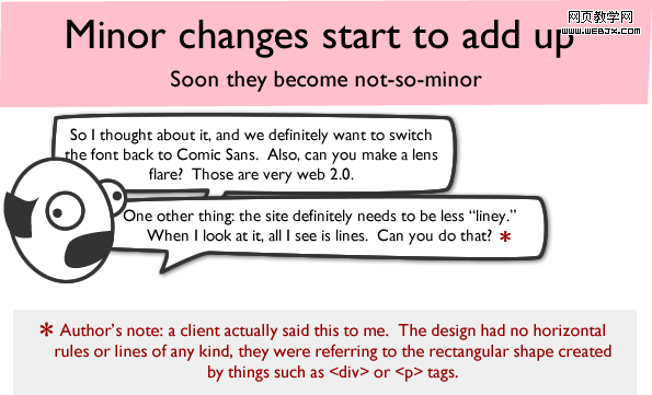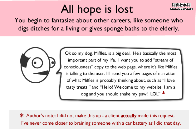 - 客户: 我考虑了一下,我们最终决定改用Comic Sans 字体。还有,你可不可以做个镜头光晕的效果?要让它们看上去很有Web 2.0 的感觉。另外还有,这个网站千万不要太“线条化”。在我看来,这网站全部都是一行一行的。你能再调整一下么?