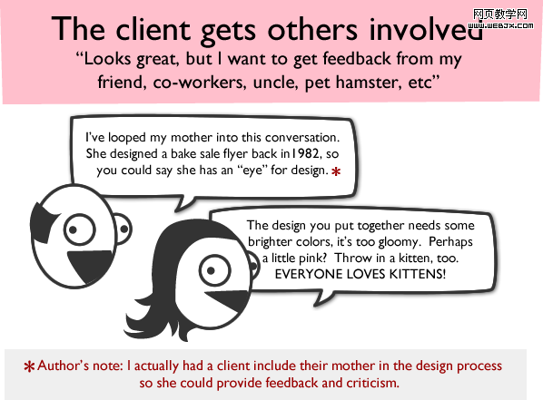 - 客户他母: 你的这个设计需要点更明亮的颜色,它看上去太灰暗了。可以尝试加点粉色?还可以用一只小猫,人人都喜欢小猫的。